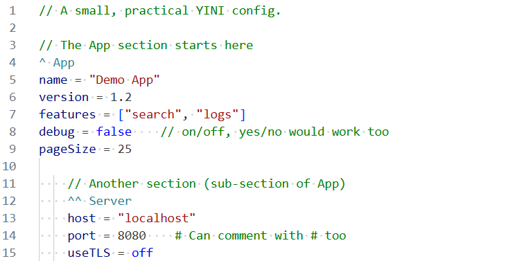 YINI is a human-friendly, text-based configuration format — less verbose than JSON, simpler than YAML, and more expressive than INI.